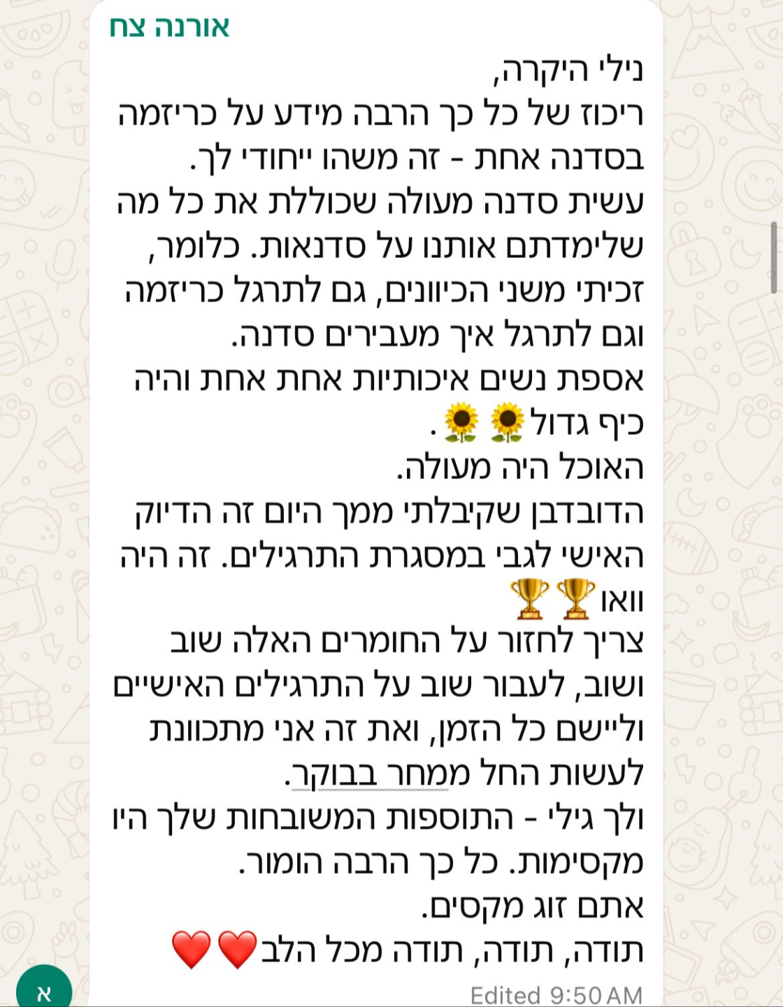 יש בך שילוב מיוחד של חוכמה, ביסוס מדעי ומקצוענות לצד רגישות ונדיבות. את דוגמה בעיני לתמהיל מושלם של מנהיגות עוצמתית שמוציאה מאנשים את המיטב.״