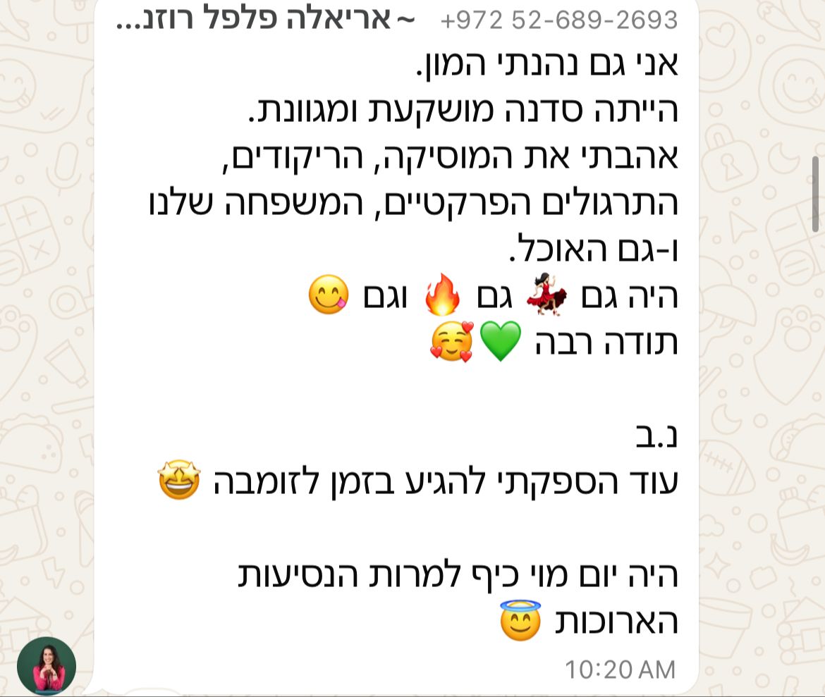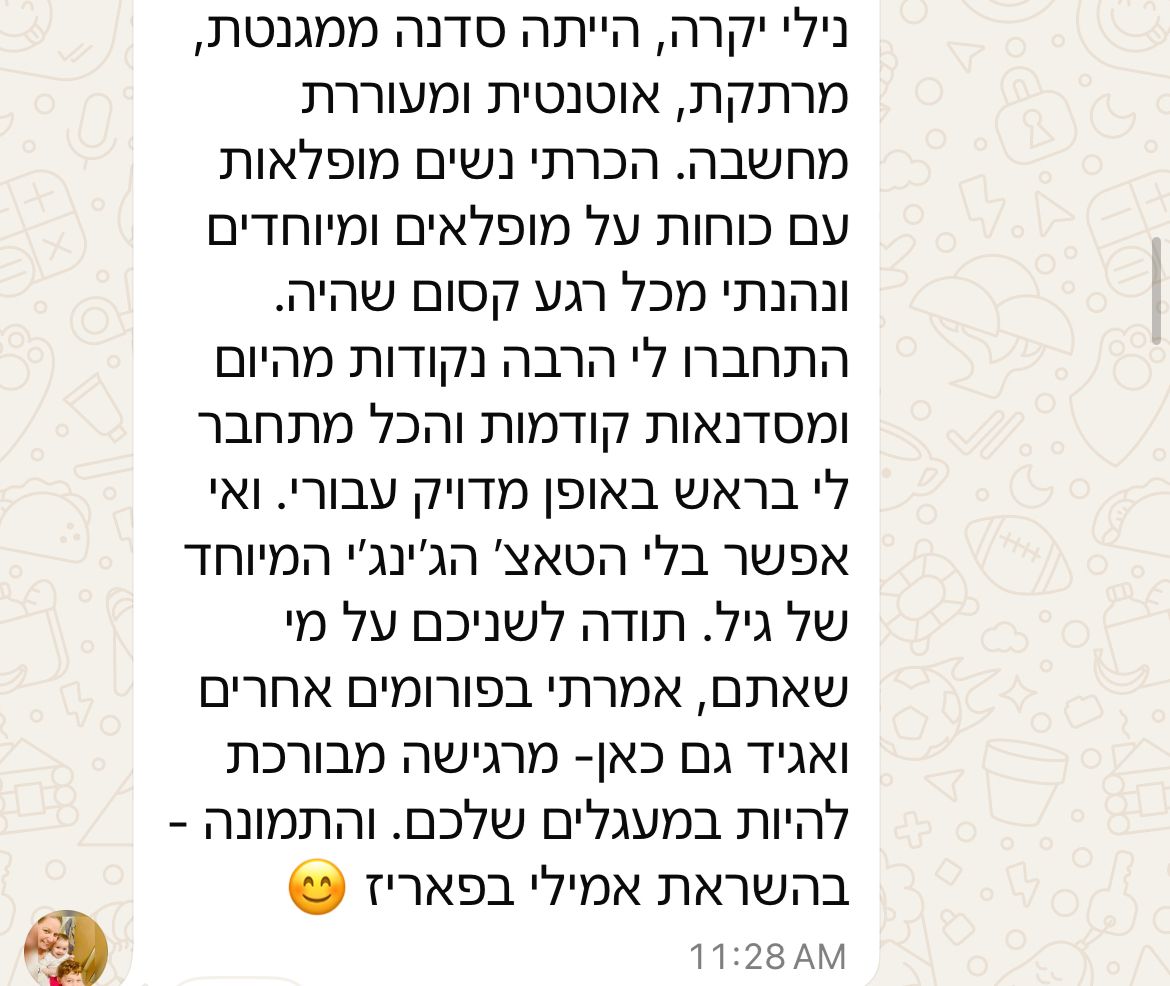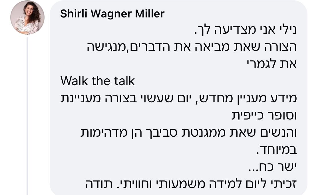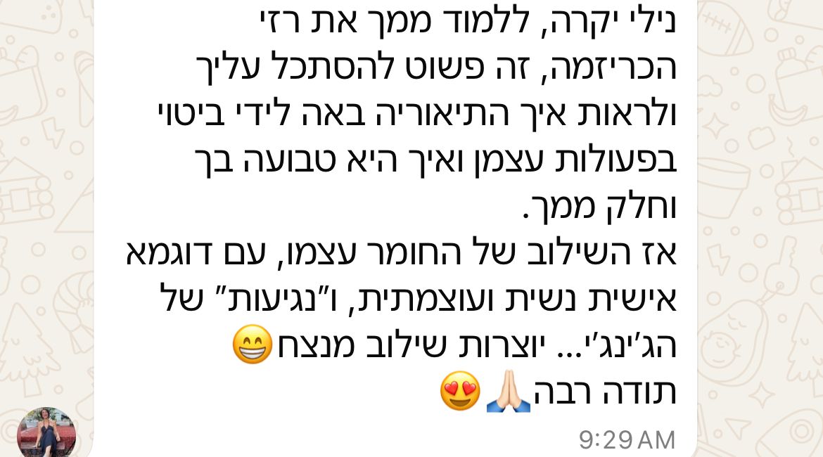 ״את אישה שהיא השראה. כל תובנה שלך בכל מפגש שלי איתך, לוקחת אותי לרמה הבאה שלי. את רואה חד, מדויק, ולא עושה הנחות. כל מה שאני צריכה כדי להוציא החוצה את מה שמבקש להתממש בעולם. את רואה אותי עמוק, לאן שאני יכולה להגיע, לפעמים אפילו אני בעצמי עוד לא יודעת שאני יכולה.״